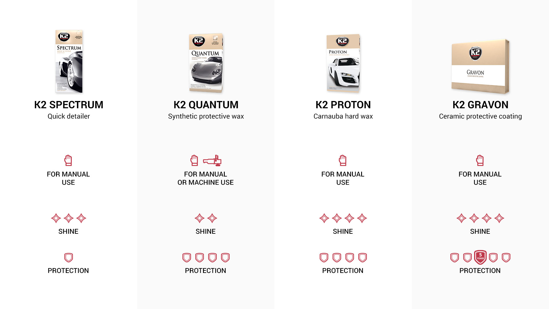 Nous avons mentionné plus tôt la brillance intense grâce au quick detailer et la protection durable offerte par la cire synthétique. La combinaison de ces deux propriétés se retrouve dans une cire dure de haute qualité enrichie de la légendaire carnaubaK2 Proton.