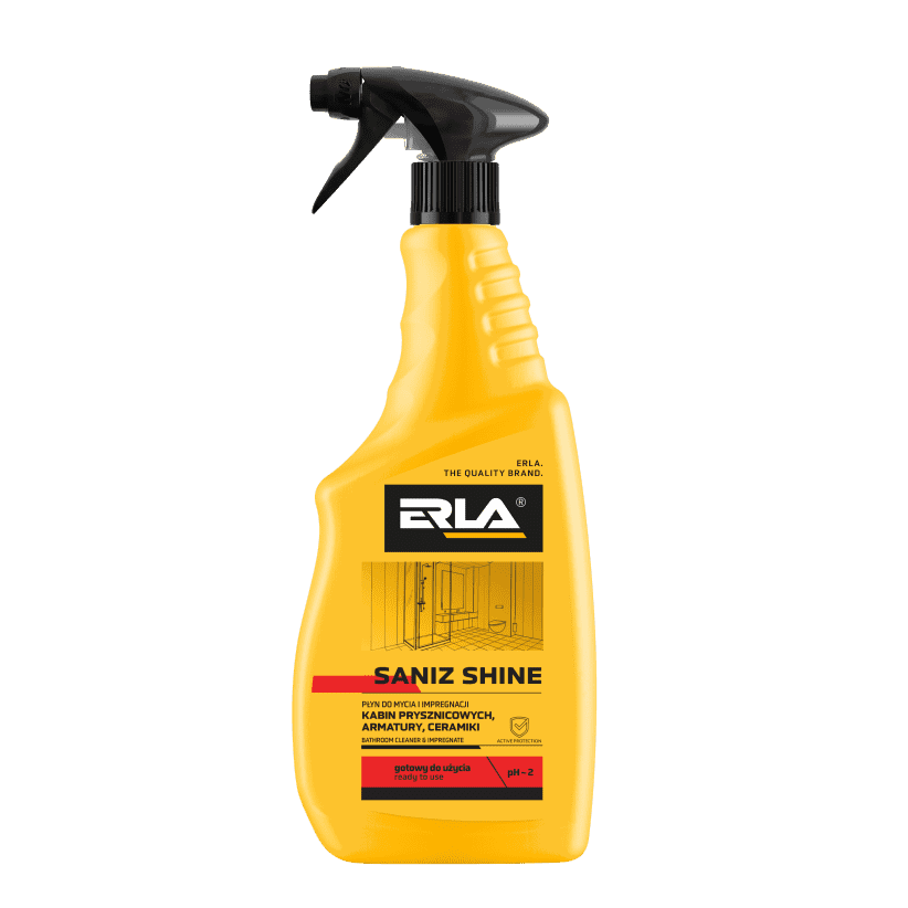 ERLA SANIZ SHINE 750 ml, agent 2 en 1 conçu pour le nettoyage et l’entretien quotidiens des surfaces résistantes aux acides. Élimine efficacement et en toute sécurité le tartre, le calcaire, les dépôts de savon, la saleté et la rouille. Il redonne de l’éclat et réduit la durée des lavages.